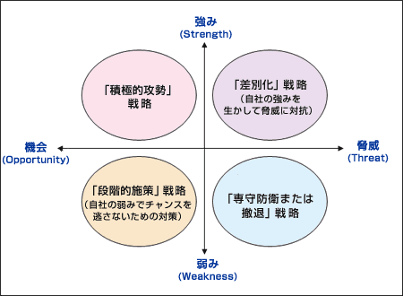 たとえば、事業の「強み」となる分野に「機会」があるときは、最大の事業チャンスがあることになるので、積極的に攻めてもよさそうだ、といったことを分析・判断できます。