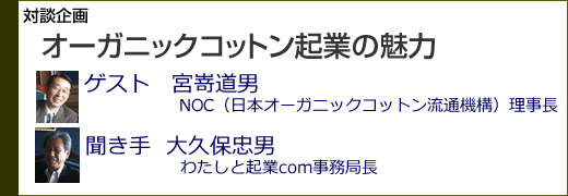 第1回は、<オーガニックコットン起業の魅力>というテーマで、NOC(日本オーガニックコットン流通機構)理事長の宮嵜道男さんに話を聞きました。